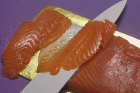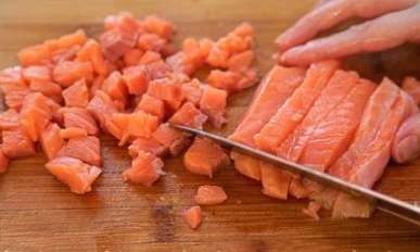 - Een rode vis kiezen. Zalm of zalm werken goed. Snijd het product in kleine blokjes.