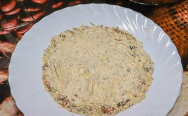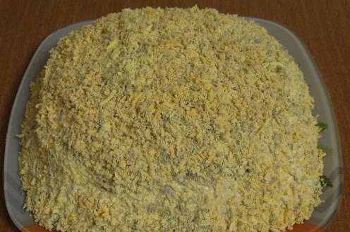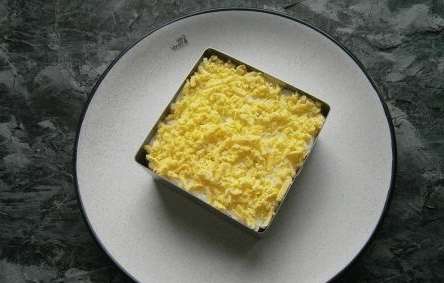 - Kook kippeneieren. Scheid de eiwitten van de dooiers. Maal eerst de eiwitten en leg ze in een gelijke laag op een plat bord. Bestrooi met mayonaise.