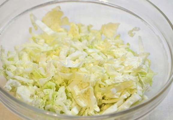 - We wassen de Chinese kool en hakken de benodigde hoeveelheid voor de salade fijn.