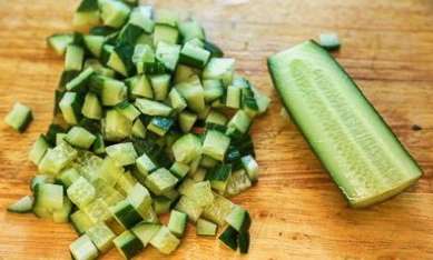 - Vervolgens wassen we de komkommer en snijden deze ook in blokjes, net als de vis.