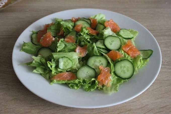 Delicate en eenvoudige salade is gemaakt van rode vis en komkommers. Het gerecht komt er fris en aromatisch uit. Serveer het voor een klein, licht diner voor twee.