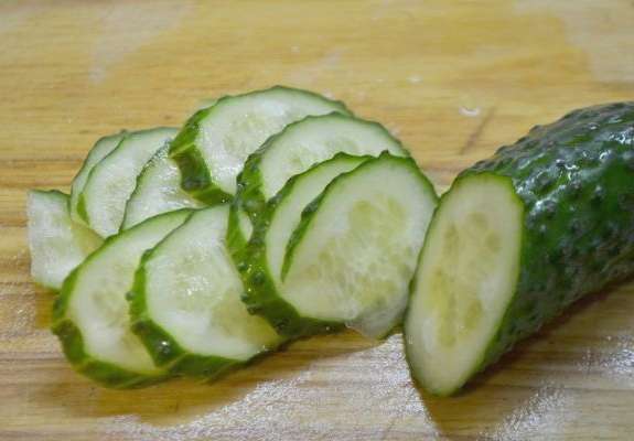 - Snijd een grote komkommer in dunne plakjes.