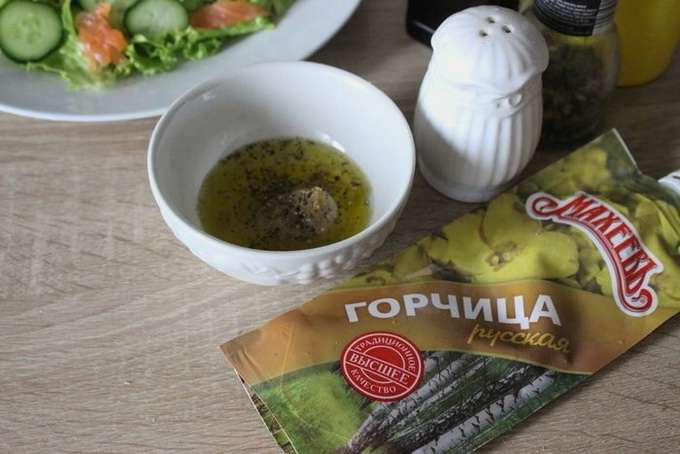 - Laten we nu de saladedressing bereiden. Roer olijfolie met citroensap, mosterd, zout en kruiden in een bordje.