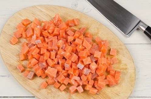 - Verwijder indien nodig de schil en de botten van de rode vis. Snijd het product vervolgens in kleine blokjes.