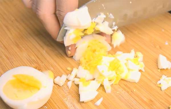 - Kook een kippenei, koel het af en hak het fijn met een mes.