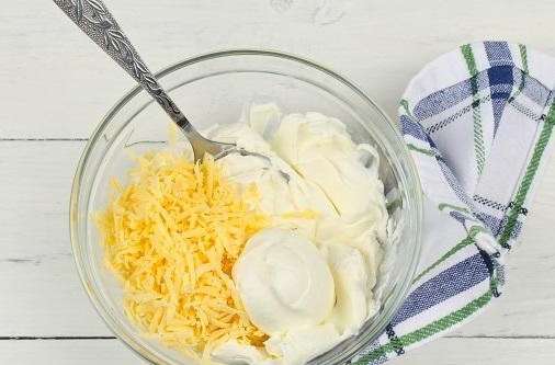 - Giet lichte mayonaise bij de kwark en voeg gewone harde kaas toe. Roer voorzichtig. Ook het ei, de vis en de kaviaar verspreiden we hier. Kneed de ingrediënten opnieuw voorzichtig.