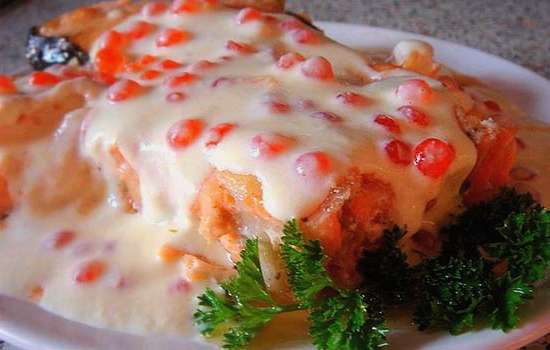 - Wrijf harde kaas. We smeren de helft ervan op rode vis en bestrijken het opnieuw met mayonaise.