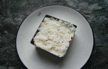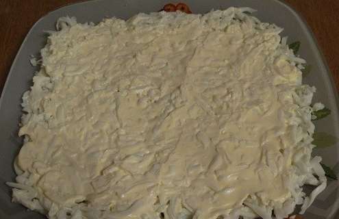- We verspreiden nog wat geraspte kaas. We fixeren de laag met de laatste lepel mayonaise.