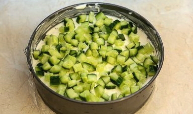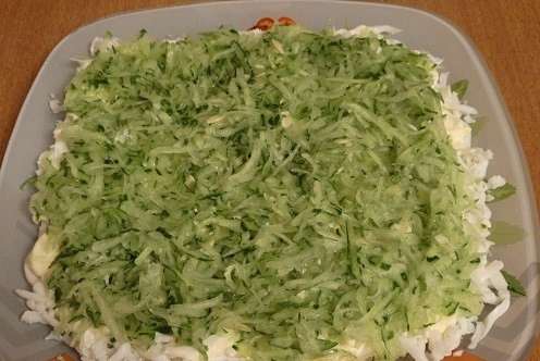 - Wrijf de komkommers op een rasp en verdeel de resulterende laag op de eiwitlaag.