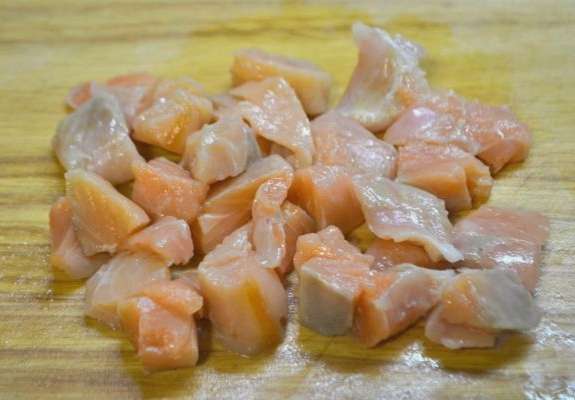 - We kiezen rode vis naar smaak. Snijd het in kleine blokjes.