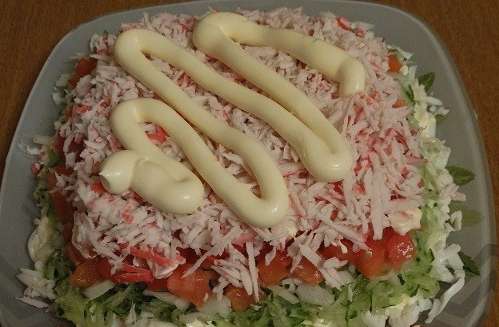 - Maal vervolgens de krabsticks. Een stuk kan opzij worden gezet voor decoratie. We verspreiden de krablaag en gieten deze met een eetlepel mayonaise.