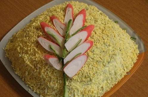 Krabsticks gecombineerd met rode vis geven een heldere en rijke smaak. Het voorgerecht kan bij een speciale gelegenheid worden geserveerd. Het gerecht zal uw gasten aangenaam verrassen en een echt hoogtepunt op tafel worden.