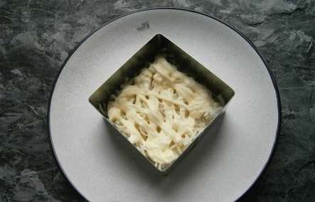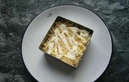 - Sla kan in lagen worden gevormd voor een helderdere presentatie. Wrijf eerst de kaas. We leggen een deel ervan op een plat bord en gieten een kleine hoeveelheid mayonaise.