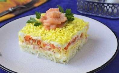 Een koud voorgerecht gemaakt van rode vis, kaas en eieren is mals en interessant. Daarnaast is deze salade erg voedzaam en toch licht van smaak.Geschikt voor een origineel diner of een feestelijke tafel.