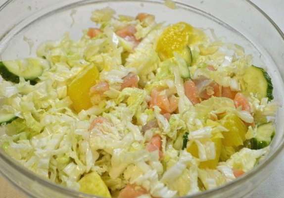 Van rode vis en Chinese kool kan een originele en lichte salade gemaakt worden. Het aperitief zal je thuistafel versieren en je gezin verrassen met zijn delicate en gedenkwaardige smaak. Probeer het!
