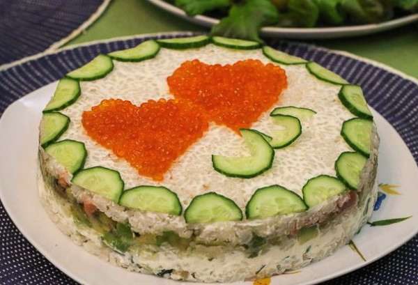 Een heldere en rijke salade van kaviaar en rode vis komt vrij origineel en bevredigend uit. Het gerecht kan zowel met het gezin als aan de feesttafel geserveerd worden. Verras je familie!