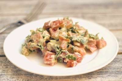 - Verdeel de tomaten vervolgens in kleine blokjes en leg deze ook op de salade. Bestrooi met mayonaise.