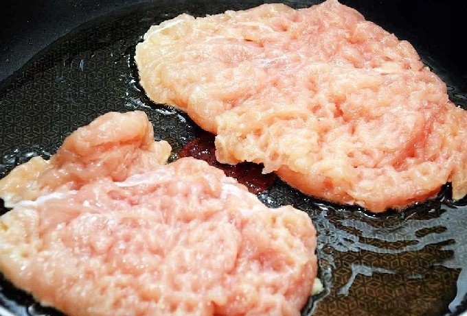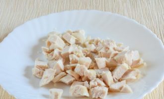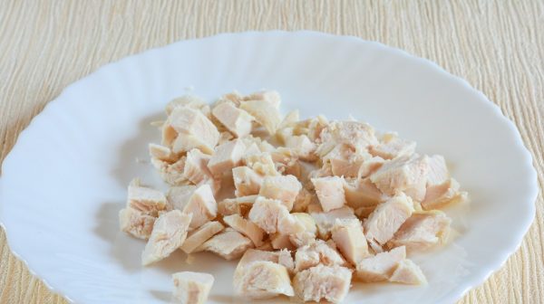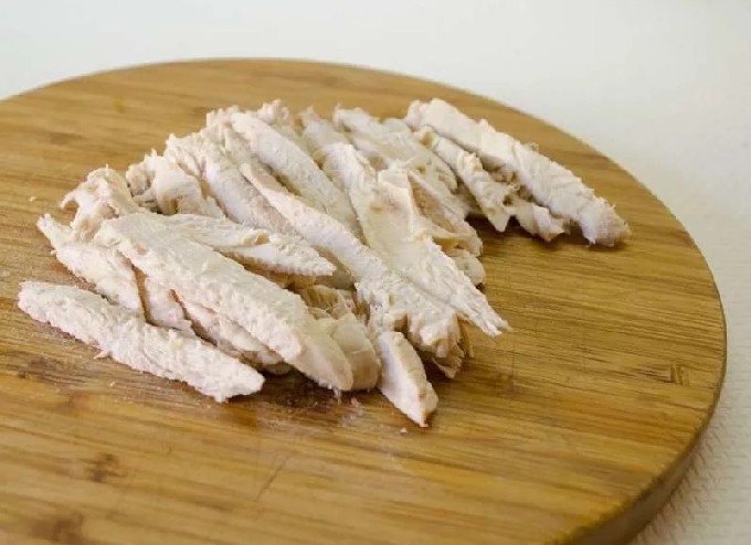 We wassen de kipfilet, snijden het spit en eventueel vet eraf. In plaats van borst kun je dijfilet gebruiken, het vlees van dit deel van de kip is sappiger. Kook de filets in gezouten water tot ze gaar zijn. Laat het afkoelen en snijd het dan in kleine blokjes.