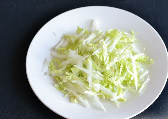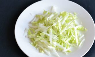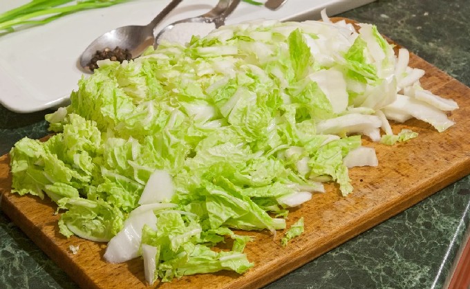 We wassen de Chinese kool onder stromend water, verwijderen indien nodig de bovenste bladeren, als hun uiterlijk niet bij ons past. Hak de kool fijn en doe deze in een grote schaal, waarin we de salade zullen verzamelen.