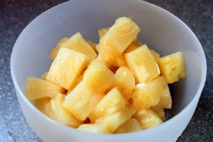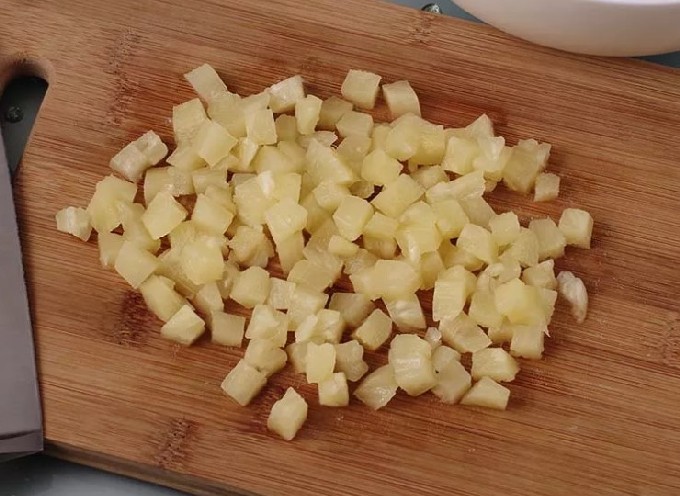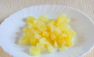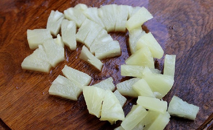 - We halen de ananas uit de pot, laten een beetje marinade uit de pot om bij te tanken. Als het fruit in de pot de vorm van een kubus heeft, verplaatsen we het onmiddellijk naar de kip, als het de ringen zijn, snijden we het in kleine stukjes.