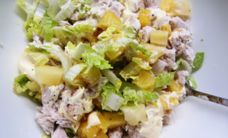 De selectie is indrukwekkend, de opties met Pekingkool zijn vooral interessant - omdat ik het volgens een soortgelijk recept doe, voeg gewoon geen ananas toe aan de salade zelf, maar gemarineerde kipfilet met ananas voordat je in zoetzure saus in blokjes frituurt, nadat het is afgekoeld - ik snijd de kaas in blokjes ( Rodomir of Roquefort is goed), een beetje ui (fijn hakken) en ook bloemkool, in blokjes van maximaal 1 cm wat zou zijn, breng op smaak met mayonaise, je hebt niet nodig om te wachten tot de salade is gebrouwen - serveer meteen.