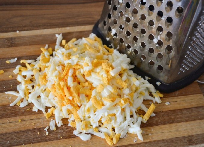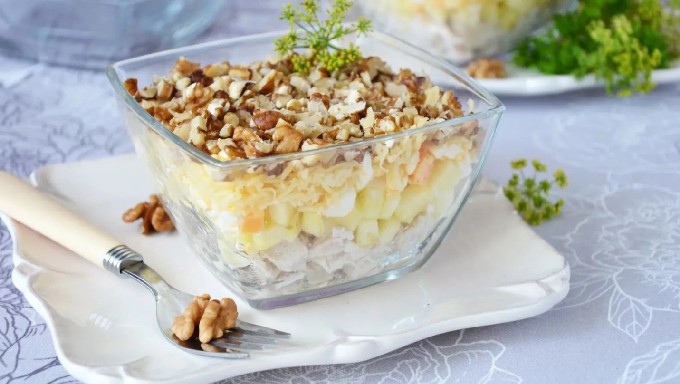 - Indien gewenst kunnen de ingrediënten in de salade in willekeurige volgorde in lagen worden gelegd, het belangrijkste is om alle lagen goed te coaten met mayonaise.