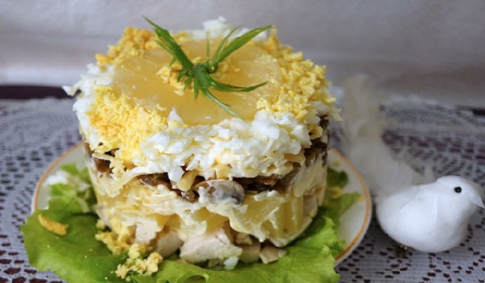 - Hoe salade koken met kip, ananas, champignons, ei?