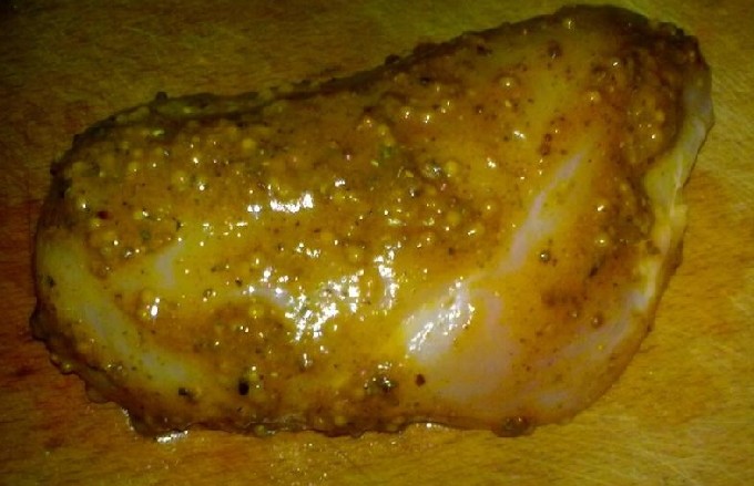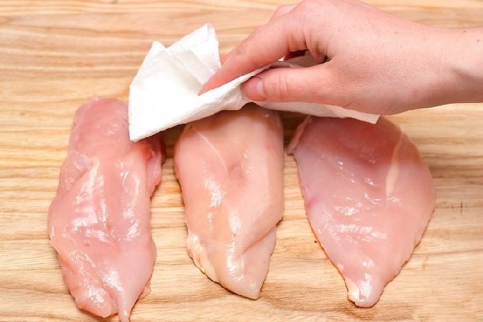 - Was de filets, verwijder spitten en strepen. Meng kruiden, zout en olie tot pap is gevormd en vet het vlees in met dit mengsel. Laat 30 minuten in de koelkast marineren, verwijder, wikkel in folie en bak 30 minuten in de oven op 190 graden. De filet moet afkoelen in folie. Daarna demonteren we het pluimveevlees tot vezels, indien nodig halveer je ze met een mes.