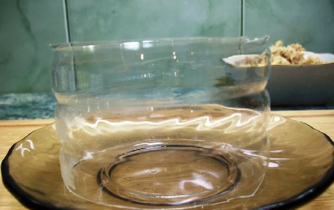 - We nemen de vormring. Als je het niet hebt, haast je dan niet om naar de winkel te rennen - je kunt het maken met geïmproviseerde middelen, namelijk 1,5 of 2 liter. snijd de bodem van de plastic fles en, een stap terug 10 cm, snijd de ring. Je kunt de salade natuurlijk gewoon in lagen leggen, maar het verschil in ontwerp zal aanzienlijk zijn.
