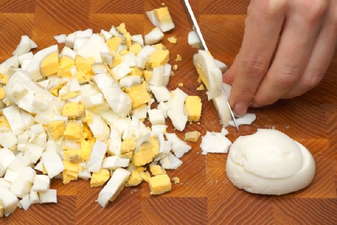 - Kook de eieren 10 minuten zodat ze hardgekookt zijn. Onmiddellijk enkele minuten in koud water dompelen, schoonmaken en in blokjes snijden.
