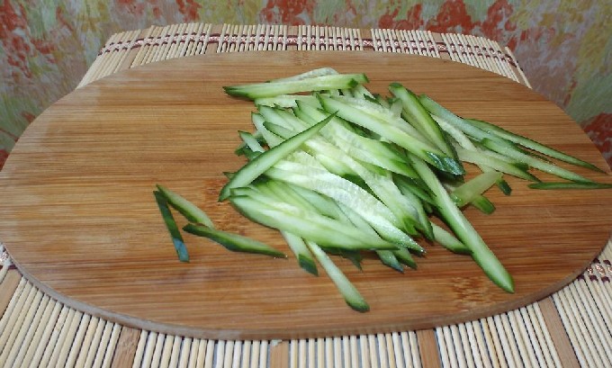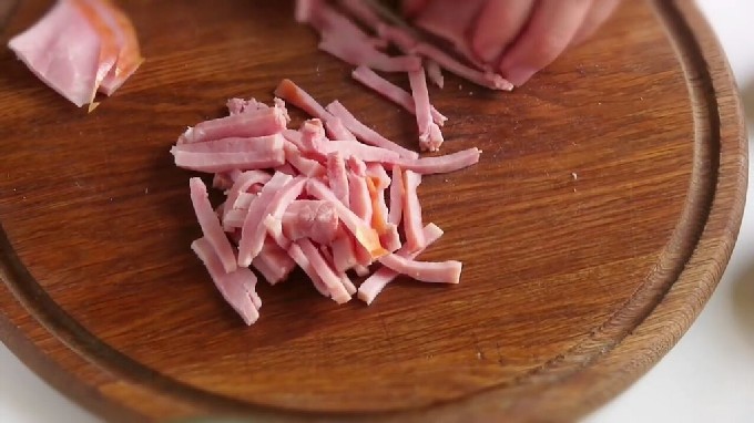 - Ham-modus in dunne reepjes. Kook de eieren, hak ze in grote stukken en stuur ze naar de kip, spoel de verse komkommer, snij de staarten af en snijd ze in dunne reepjes en stuur ze dan naar de bereiding