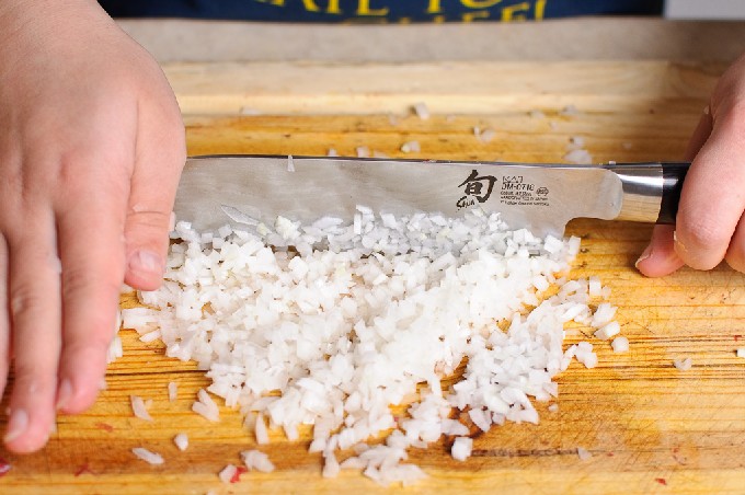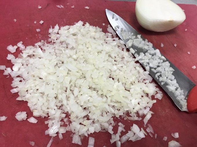 - Schil en hak de ui fijn, doe deze in een aparte kleine schaal. We wassen de pruimen en doen ze in een andere schaal. Giet kokend water in elk gerecht en laat een paar minuten staan. Knijp vervolgens de ui en pruimen voorzichtig uit en verdeel ze over de filet.