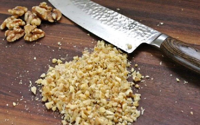 - De korrels kunnen een beetje worden gedroogd in een hete droge koekenpan of in de magnetron gedurende 2 minuten. Hak ze met een mes in grove kruimels of hak ze in een vijzel en voeg toe aan de salade.