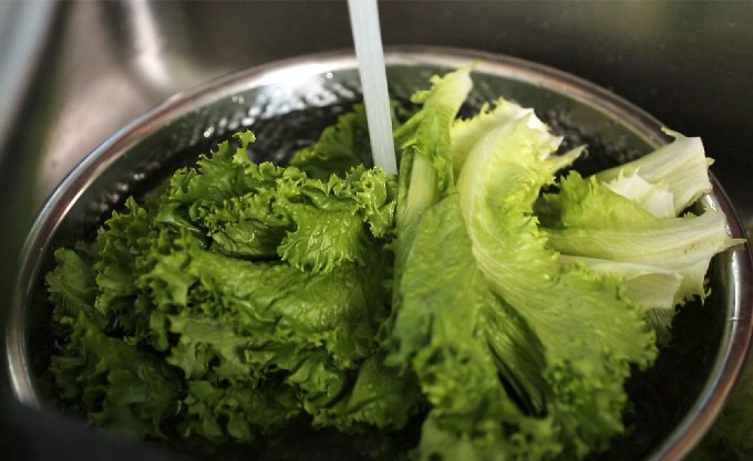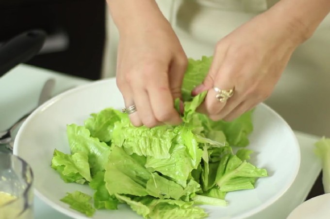 - We wassen de salade onder stromend water, drogen hem af met een papieren handdoek, demonteren hem in bladeren en scheuren hem met onze handen in stukken die zo groot zijn dat hij gemakkelijk te eten is.