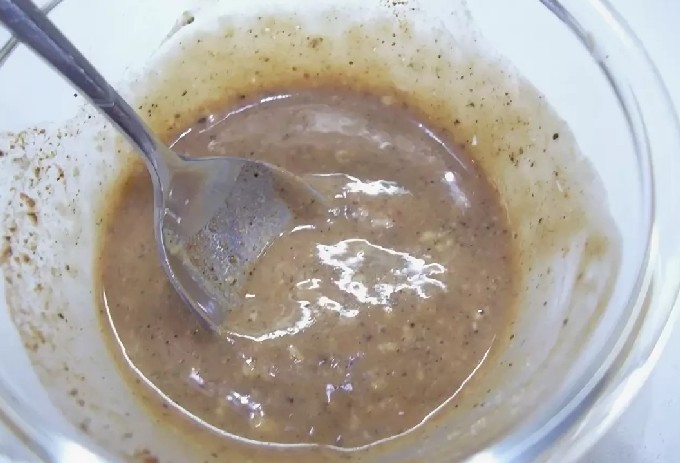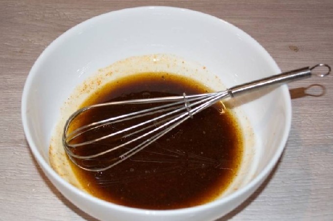 - Meng mayonaise, mosterd, balsamicoazijn en sojasaus in een aparte kom tot een gladde massa.