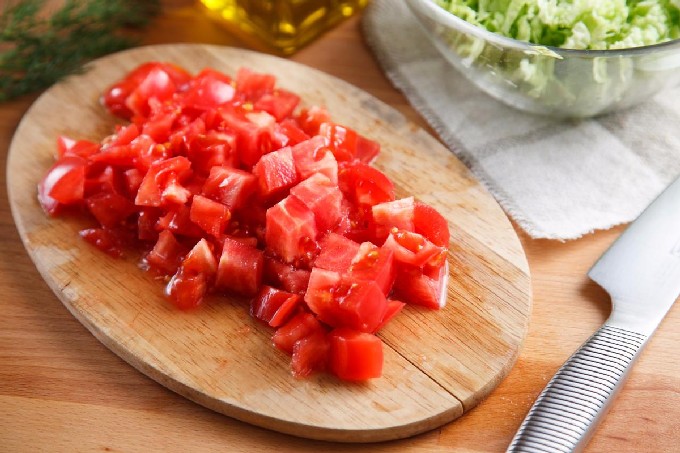 - Maak eerst de gerookte kip los van het bot, indien aanwezig, en snijd deze in kleine blokjes van 2 cm Snijd gewassen tomaten en ananas uit blik in ongeveer dezelfde grootte. Tomaten moeten vlezig en dicht zijn, bij het snijden mag overtollige vloeistof niet aan de salade worden toegevoegd, anders zal de salade veel sap afgeven en erin drijven.