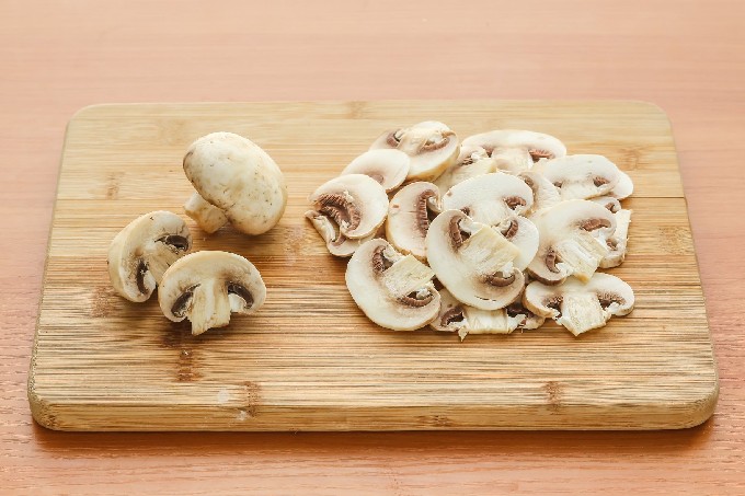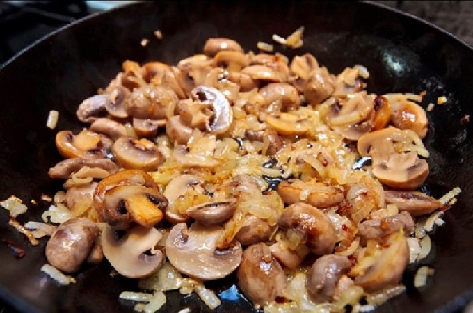 - Pel de ui en hak hem fijn met een mes. We maken de champignons schoon, snijden ze in plakjes. Verhit de pan op het fornuis, voeg plantaardige olie toe, doe de ui erin, bak goudbruin, voeg de champignons toe, meng en breng aan de kook, voeg op het einde een beetje zout en peper toe.