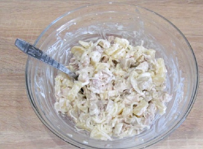 - We maken de salade in laagjes. Neem hiervoor een kom van de vorm die we een salade willen hebben, bedek deze met huishoudfolie. De eerste laag is champignons, dan uien. Spreid de laag strak uit en druk met een lepel tegen de randen. Smeer met een kleine gelijkmatige laag mayonaise. Vervolgens - kaas, mayonaise, ananas, kipblokjes en grondig bedekken met mayonaise. En bedek met aardappelen, die we licht zout, peper en bedekken met mayonaise. We stampen elke laag met rustige bewegingen aan met een lepel.