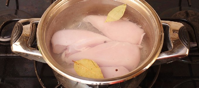 - Kook de kipfilet in ongeveer 30 minuten gaar in gezouten water, waarin we lavrushka, een paar peperkorrels en kruidnagel toevoegen. Het is belangrijk om het niet te gaar te maken, anders wordt het vlees droog. Na - haal het vlees uit de bouillon en laat afkoelen.