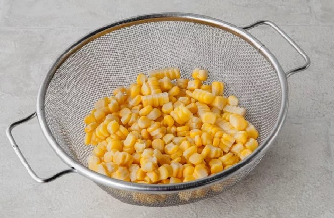 - Snijd de filet dwars op de draad in grote stukken en vouw deze over de rijst. We halen de ananas uit de pot en snijden in blokjes. We tuimelen de maïs in een vergiet en wassen het een beetje met stromend water, wachten tot de vloeistof is weggelopen en voegen het toe aan de salade samen met ananas. Snijd de staarten van de komkommer en snij in blokjes.
