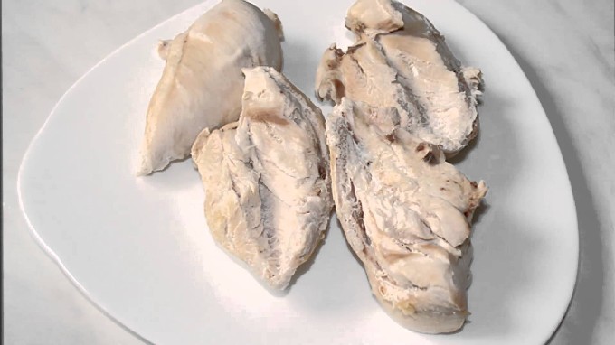 - We wassen de kipfilet, verwijderen het vel, snijden het spit en eventueel vet eraf. U kunt borst- of dijfilets gebruiken. Kook de filets in gezouten water, laat afkoelen.