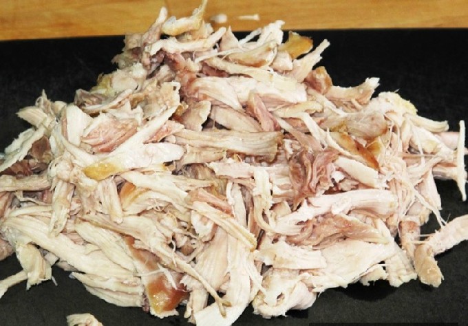 - Kook de kipfilet of drumstickfilet gaar. Verdeel in vezels of snijd en doe in een kom.
