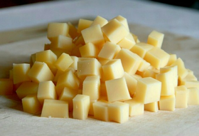 - De kaas moet van harde variëteiten zijn, snijd hem in kleine blokjes. Meng voor de dressing mayonaise met twee teentjes gehakte knoflook, kruiden, boter en een paar eetlepels sap uit een blikje ananas. Roer goed door en voeg de dressing toe aan de slakom.