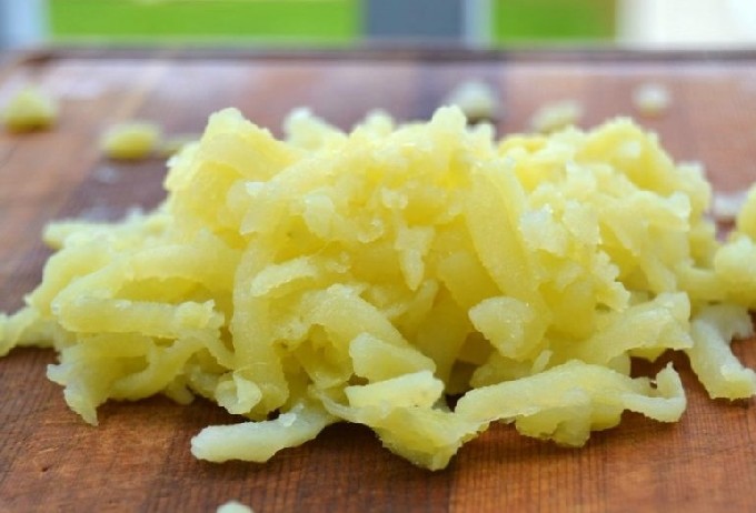 - We wassen de aardappelen goed, met een borstel of spons, om vuil te verwijderen. Doe de schil in kokend water in een pan. Het water moet de aardappelen volledig bedekken. Kook de aardappelen gaar, waarna we ze eruit halen, een beetje afkoelen, de schil verwijderen en op een grove rasp wrijven.