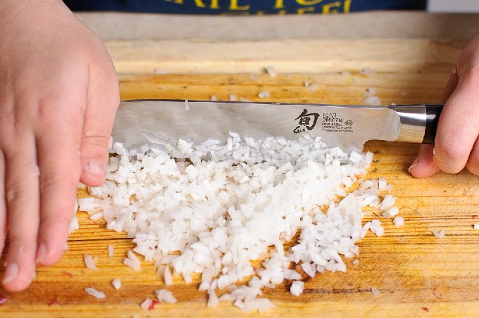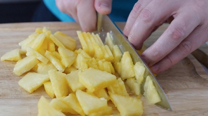 Snijd de ananas uit blik in kleine blokjes van maximaal een centimeter groot.