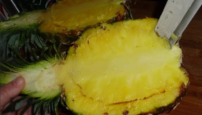 - We halen ananas uit de pot. Als je ringen hebt, snijden we ze in blokjes, en als er in eerste instantie een product van deze vorm in de pot zit, kun je het zo laten of het in tweeën delen.