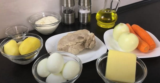 - Kook aardappelen, wortelen en kippeneieren. Maal de afgewerkte aardappelen en verdeel ze in een gelijkmatige laag op een bord. Bestrooi met peper, zout en mayonaise.