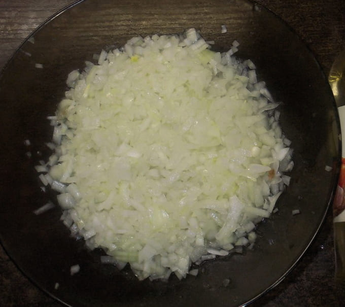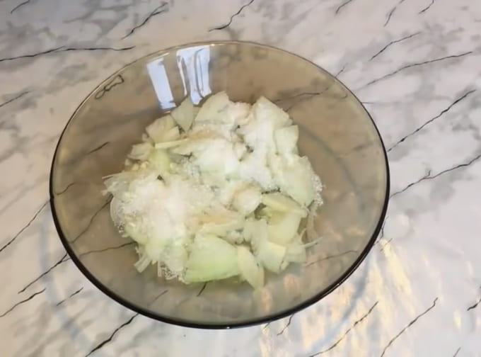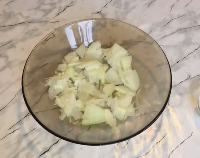 - Pel de uien en hak ze fijn met een mes. Giet azijn over het ingrediënt, roer en marineer 5 minuten.