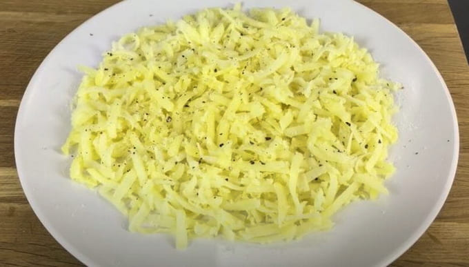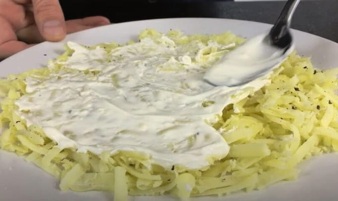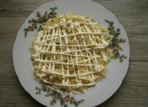 - Kook de aardappelen, schil ze en wrijf ze op een grove rasp.We verspreiden de groente in de eerste laag, bestrooien met zout en gieten mayonaise.