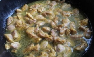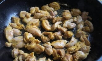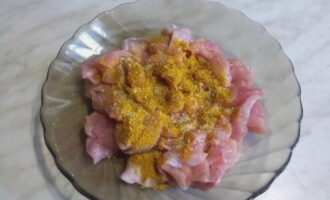 Haal het vlees van de kippenpoten, snijd het in kleine stukjes en marineer in een mengsel van zout en kerrie.